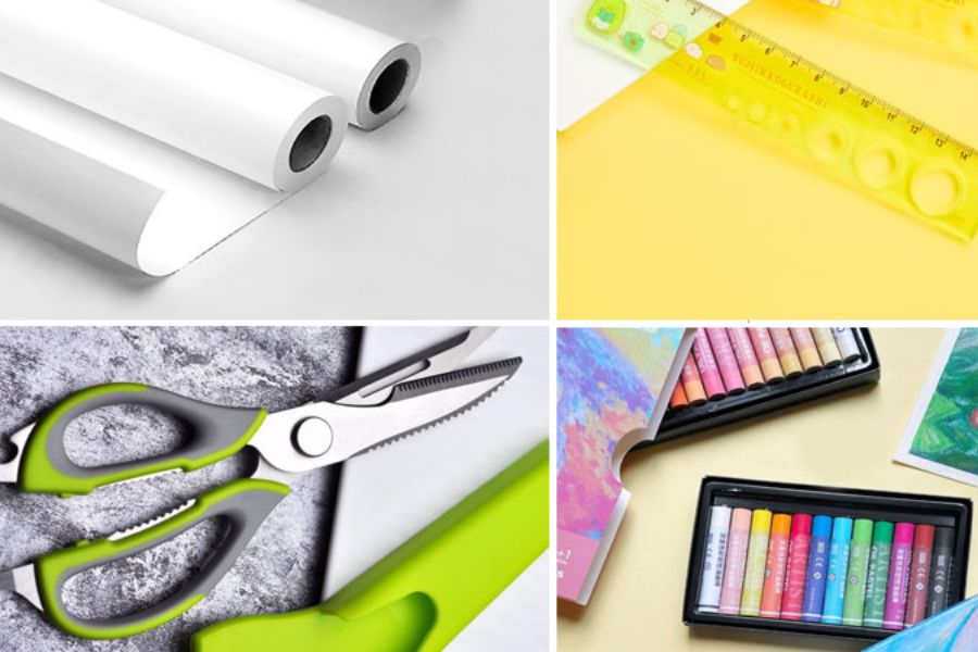 - Giấy Roki khổ A0 hoặc giấy bìa cứng nhiều màu sắc (loại dùng làm thiệp) hoặc giấy có đường vân,…