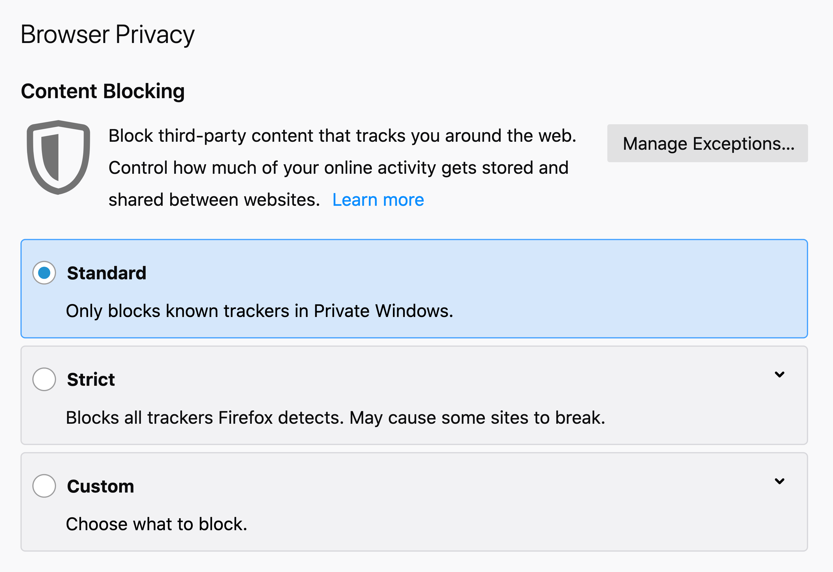 - Chế độ tiêu chuẩn: Một tùy chọn cân bằng ngăn chặn các trình theo dõi chung trong khi duy trì chức năng trang web trơn tru.