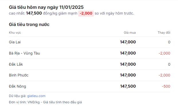 Tại Gia Lai mức giá tiêu là 147.000 đồng/kg. Đồng Nai có giá tiêu là 147.000 đồng/kg.