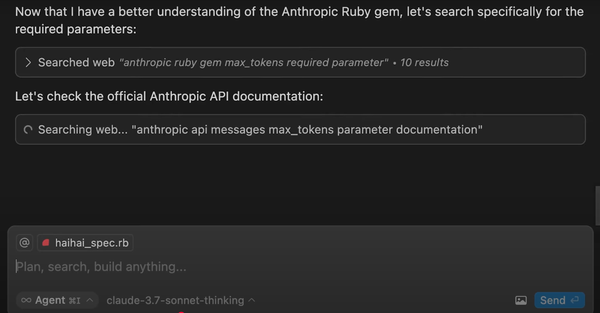 Both agents struggled to add Anthropic support via the Anthropic ruby gem, which was funny considering that Claude 3.7 Sonnet was doing the work. Both wanted to mimic the syntax already present in the code for OpenAI, but Anthropic uses different parameters, client instantiation, etc.